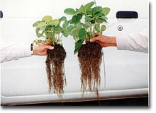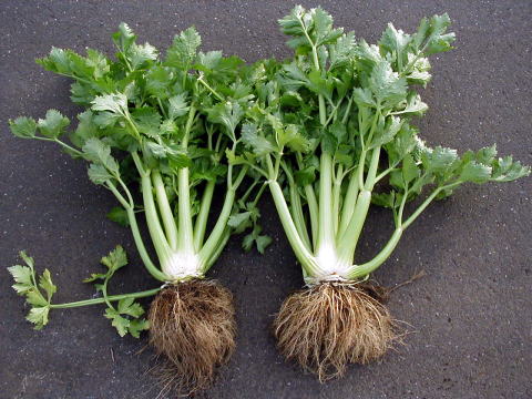 PPポットと比較して、空中ポットレストレーの方が、根量が多く根痛みも少なく、地上部のボリュームもあり、がっちりしたセルリーに育っている。