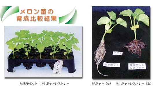 イチゴだけでなく、ほぼ全ての植物において空中ポットレストレーは、従来のPPポットやセルトレーと違い、根巻きがなく細根が多いので定植後の活着が良く、栄養吸収が良いので生育旺盛になります。