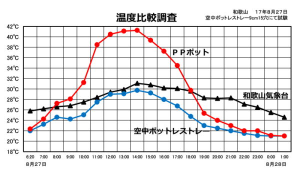 PPポットと比較して空中ポットレストレー(赤線)の方が温度が低い